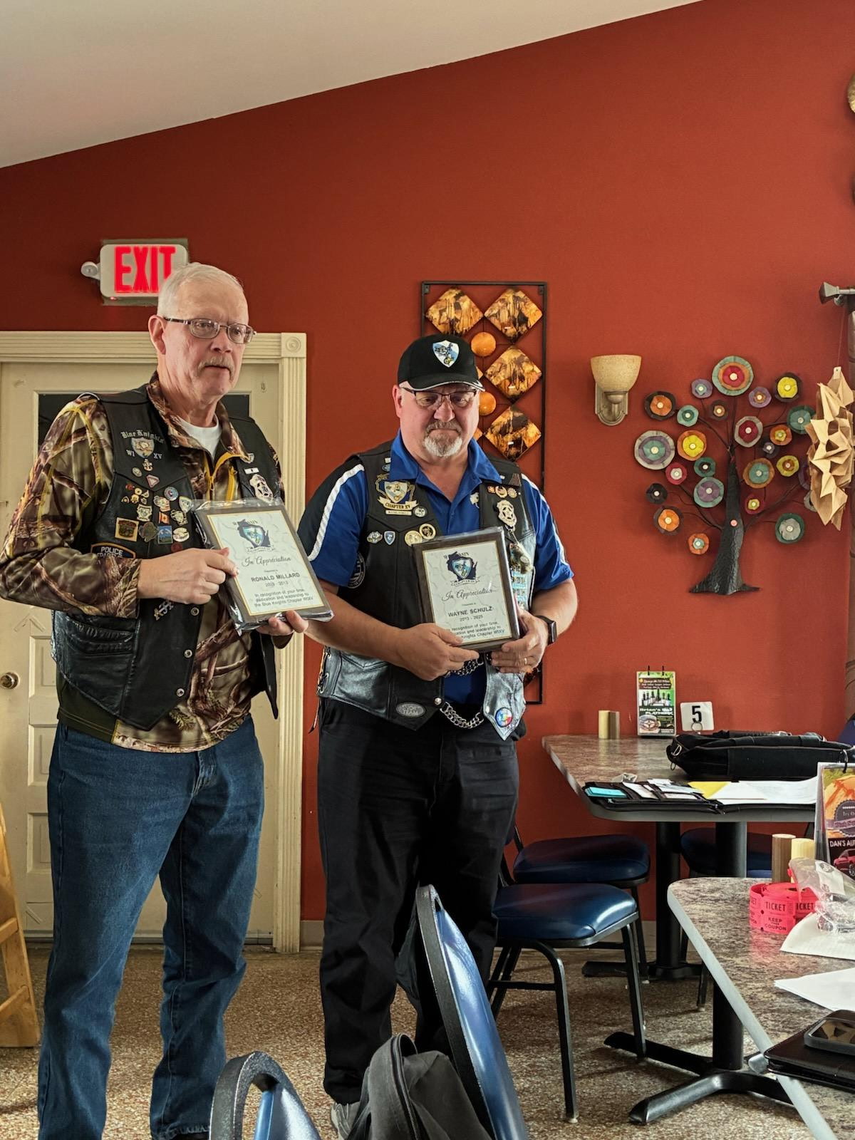 Past Presidents Ron Millard (2009-2013) and Wayne Schutz (2014-2025) receiving their plaques of appreciation for service to the Blue Knights Chapter XV.