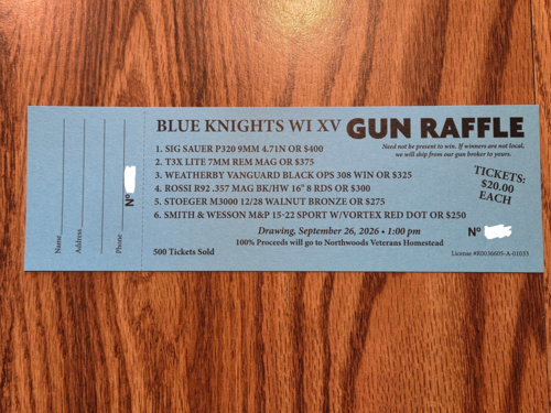 The 2026 Wisconsin Blue Knights gun raffle tickets are in and only 500 will be sold! Please contact your local Blue Knights member to get one or more.